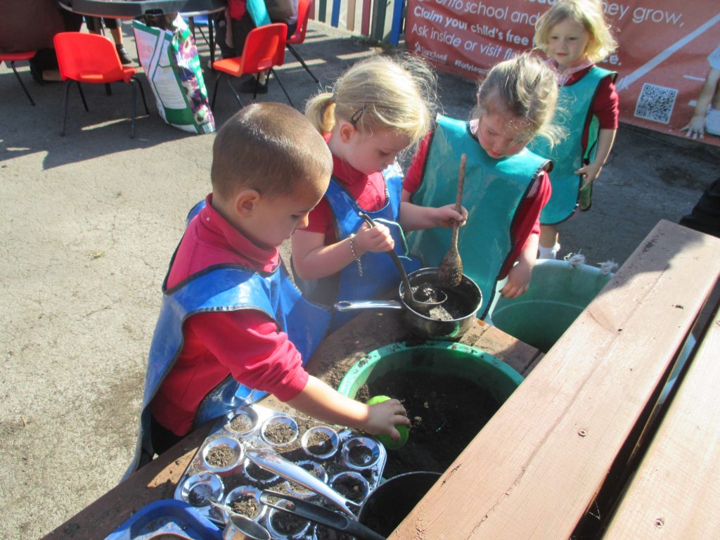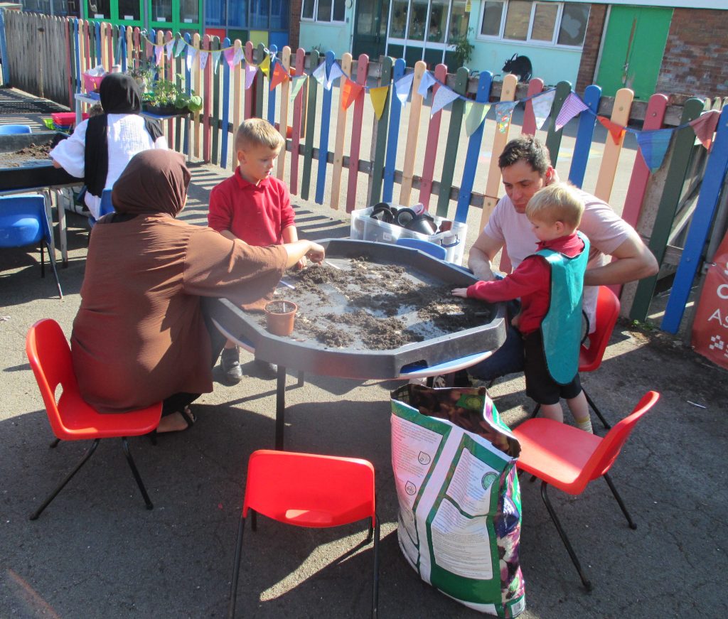 This week we have invited our families in to join their children for a gardening morning. We planted lots of seeds and plants together and the children will be taking some of them home later in the week to watch them grow over half term. After we had finished our planting we had a play in our redeveloped Mud Kitchen area. We showed our grown ups how we cook with the mud and water and we all got a bit messy. Our children loved having their families in pre-school and we can’t wait to watch the seeds grow.