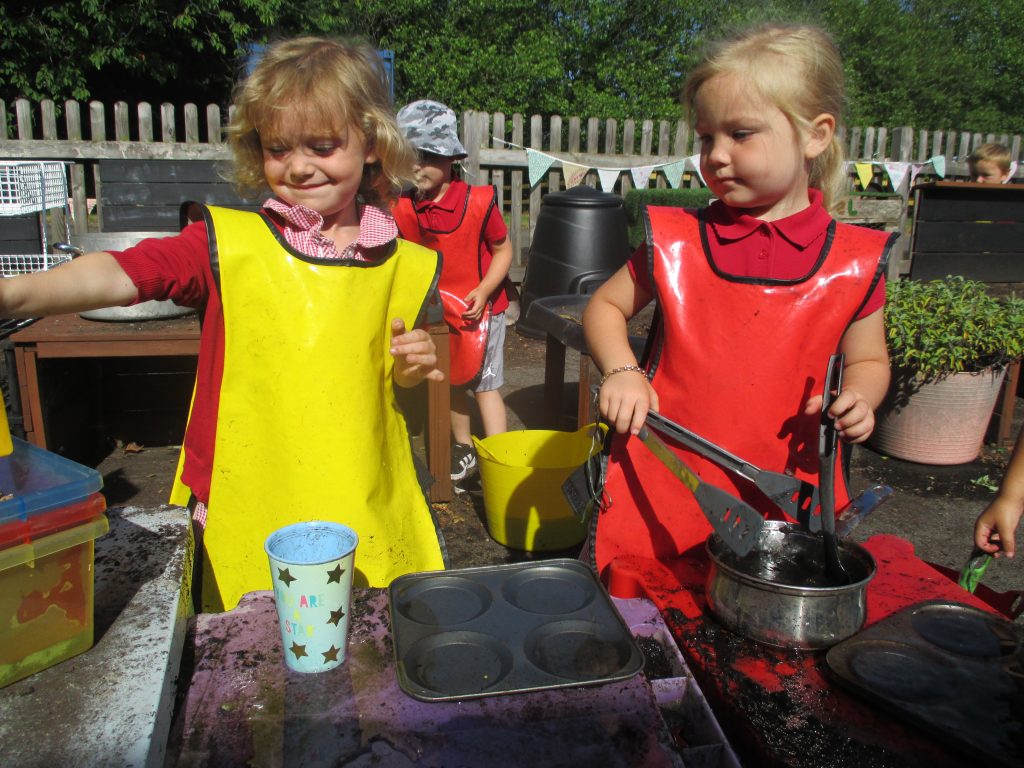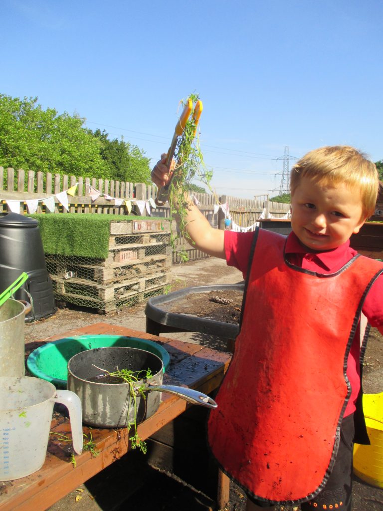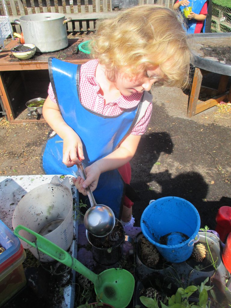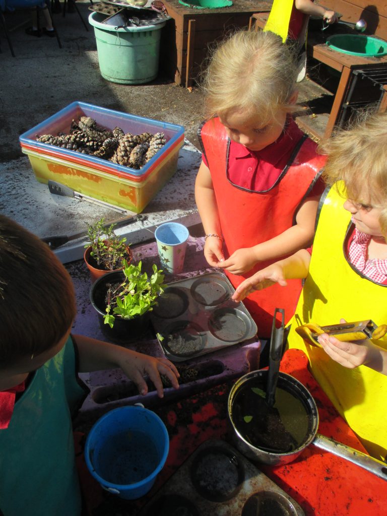 We spent a sunny morning in our Mud Kitchen today. We used some of the herbs we have been growing in our culinary creations. We made pasta, noodles and cup cakes! Our children love playing here, getting messy, using their imaginations and developing their gross and fine motor skills.