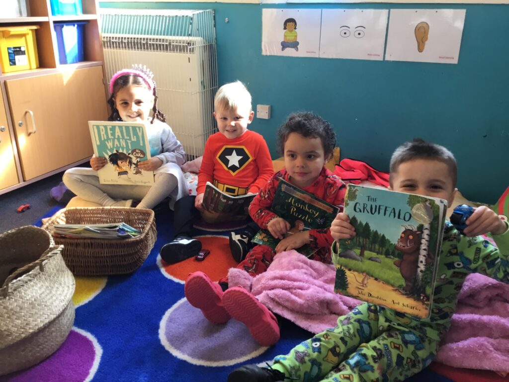 World Book Day in pre-school was brilliant fun, we decided to celebrate the importance of bedtime stories. We all came to pre-school in our pyjamas and invited our parents in to join us for the morning. A good bedtime routine and a story before we go to sleep is the best way to wind down for the day and to promote good sleeping habits. Nothing beats a story being read to a child, we know they love to hear the same story again and again but repetition is key to understanding the structure of stories and developing their vocabulary.